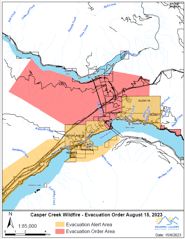 An Evacuation Alert has been issued by the Squamish-Lillooet Regional District due to immediate danger to life safety caused by the K71535 Casper Creek wildfire burning out of control in the Seton Portage area.