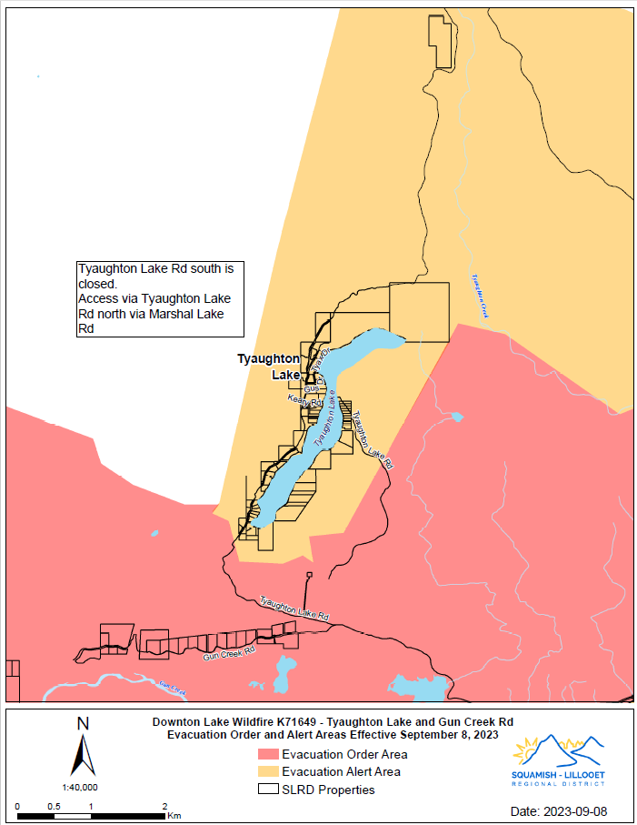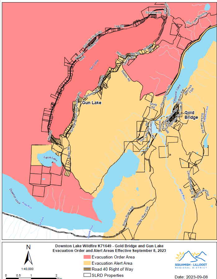 NOTE: Some properties on the east side of Gun Lake , Marshall Lake, Tyaughton Lake, Gold Bridge and Bralorne have been downgraded from Evacuation Order to Evacuation Alert. Please see the updated Evacuation Alert document issued September 8th, 2023 for more details.